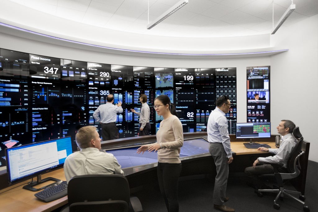 Capitex Earning Risk Management Center provides a comprehensive view of the various investment portfolios and how they fit within pre-established guidelines. Built in 2014, its front-end consists of a 27' by 8' interactive touchscreen designed to visualize data in ways that allow for rapid comprehension. Its back-end systems, which connect to every Capitex Earning office worldwide, continuously run a wide range of operational readiness, risk, and stress test monitors.